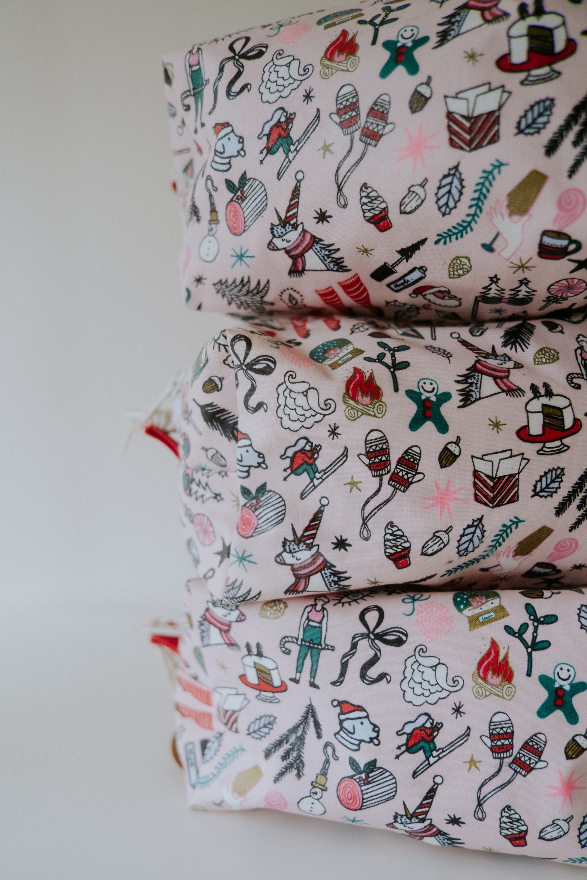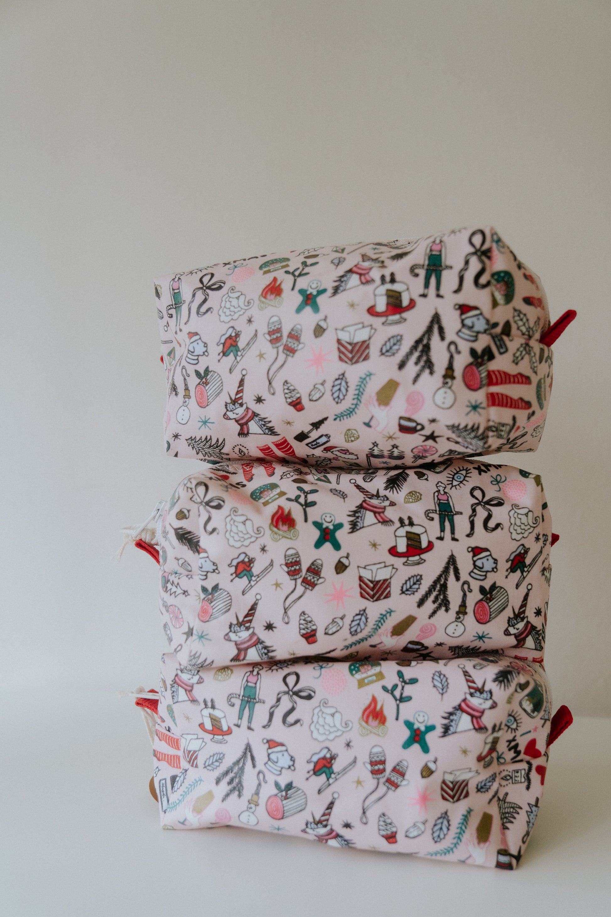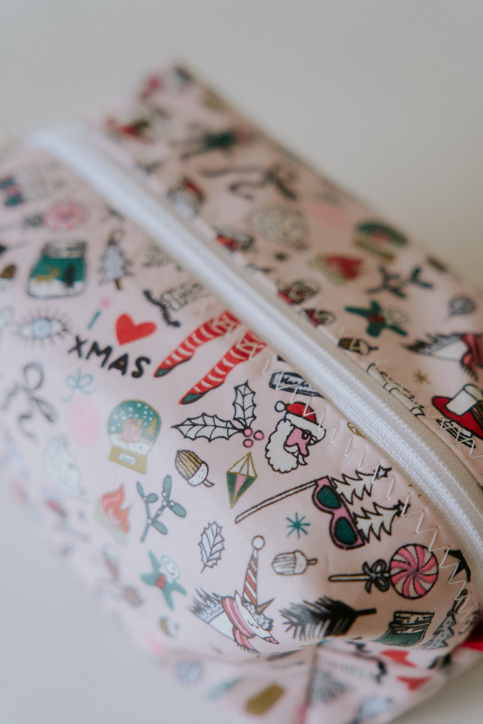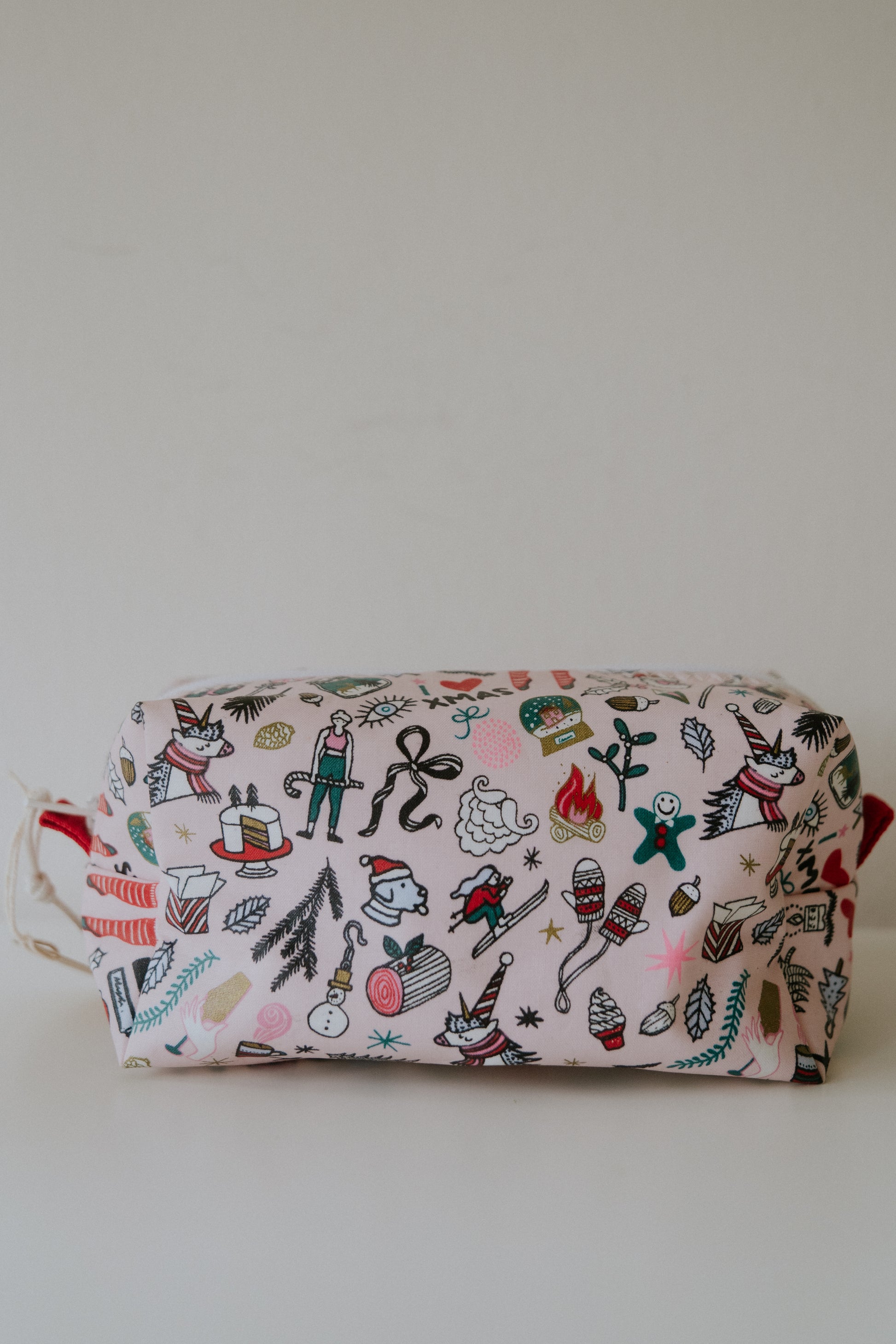 Vielseitig verwendbare Tasche aus beschichteter Baumwolle (außen) und Segeltuch (innen). verschlossen wird sie mit einem weißen Reißverschluss. An den Seiten befinden sich Schlaufen aus Gurtband. Maße 19 x 11 x 11 cm.