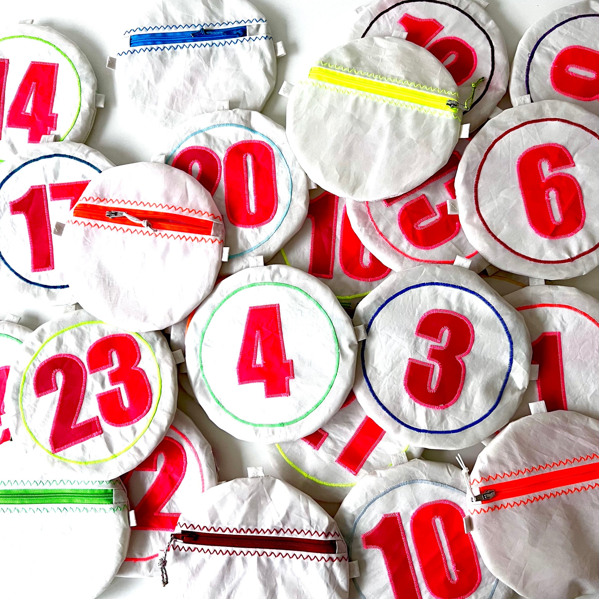 Nur auf Bestellung gibt es die einzigartigen velatini-Adventskalender aus Segeltuch. Jeder kreisrunde Beutel trägt eine Zahl auf der Vorderseite und wird auf der Rückseite mit einem Reißverschluss verschlossen. Man kann die Beutel einzeln aufhängen oder aneinander gereiht als lange Kette dekorieren. Die Farbe der Zahlen und Applikationen könnt Ihr Euch aussuchen. Falls für eine bestimmt Farbe kein buntes Segeltuch vorhanden ist, nehmen wir Stoff als Ersatz.