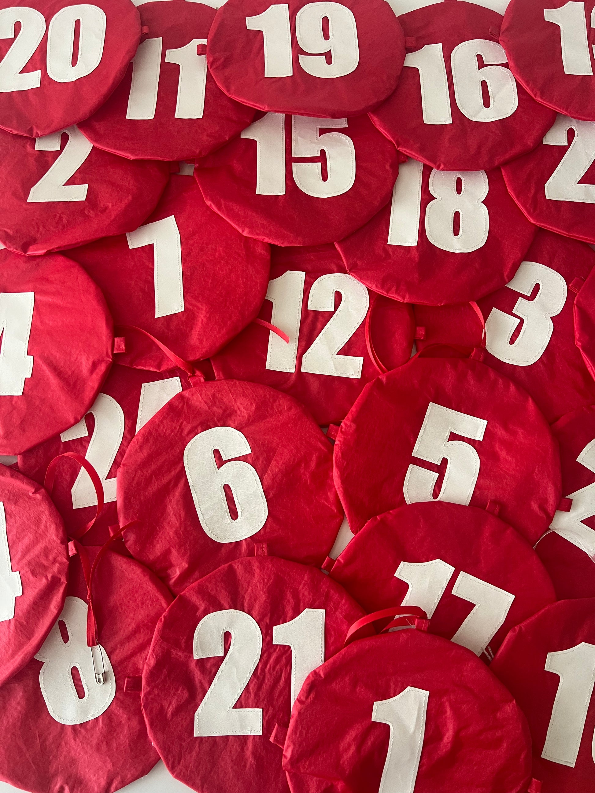 Einzigartiger velatini-Adventskalender aus doppelten Lagen von Spinnaker-Segel. Jeder kreisrunde Beutel trägt eine Zahl auf der Vorderseite und wird auf der Rückseite mit einem Reißverschluss verschlossen. Man kann die Beutel einzeln aufhängen oder aneinander gereiht als lange Kette dekorieren.